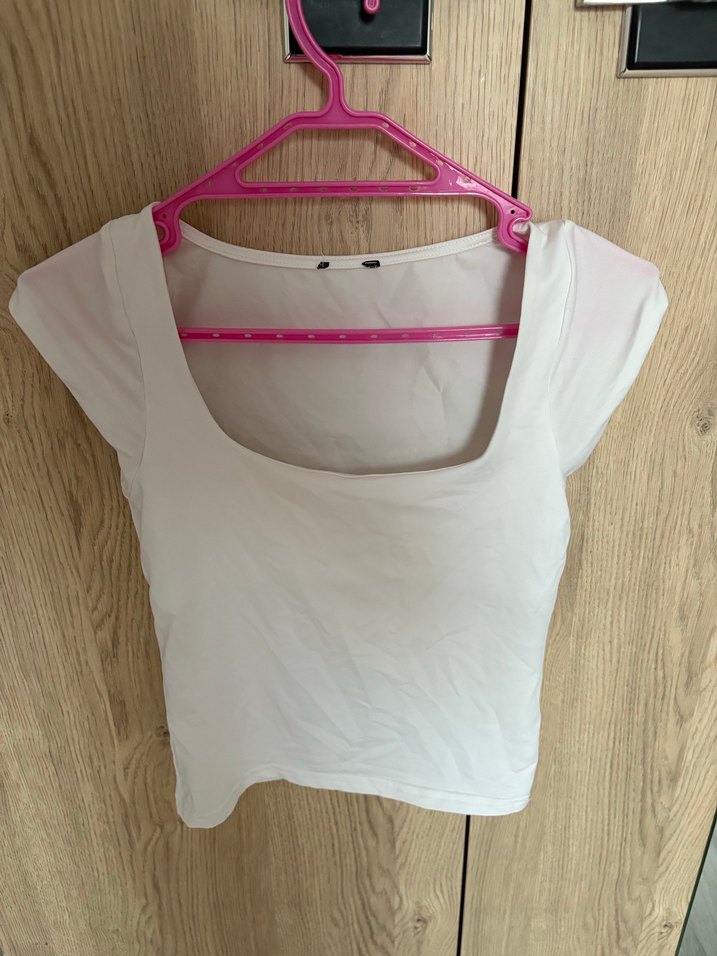 Pamuk kumaştan yapılmış, tek renk beyaz, kısa kollu, tekne yaka, vücuda oturan mini tişört. Günlük sokak stiline uygun.