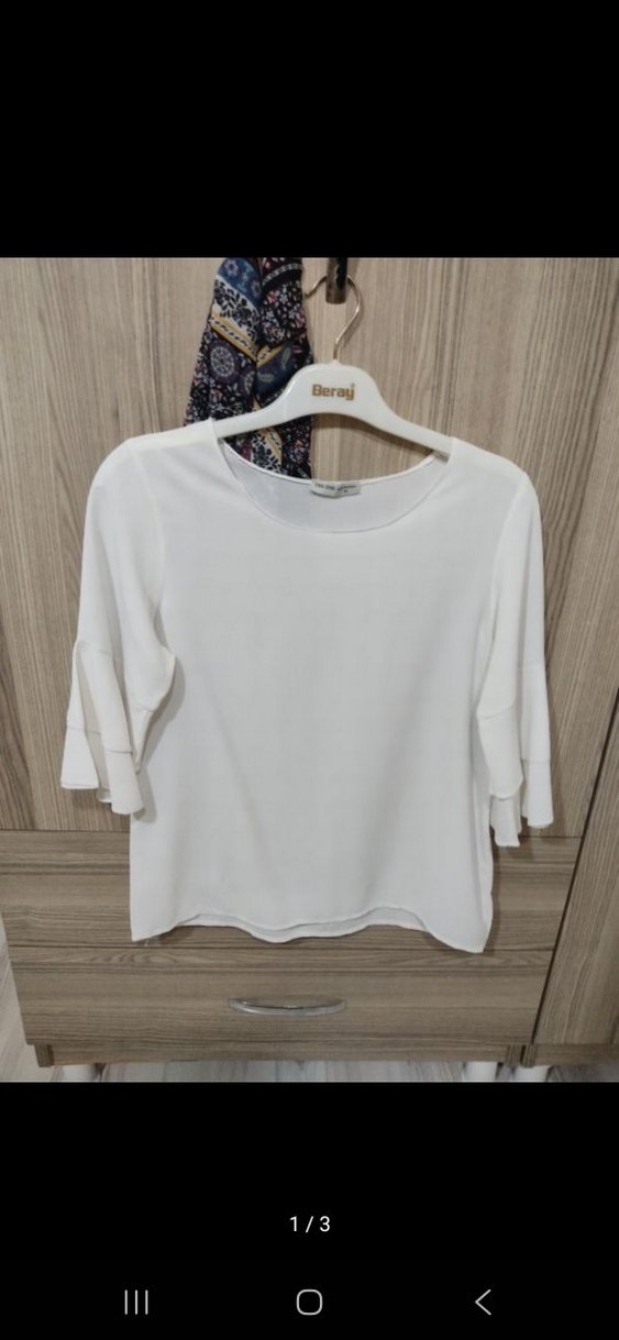 Beyaz pamuklu bluz, kısa kollu ve kat kat detaylı, yuvarlak yaka, bol ve kısa kesim ile rahat ve şık bir günlük kullanım sunar.