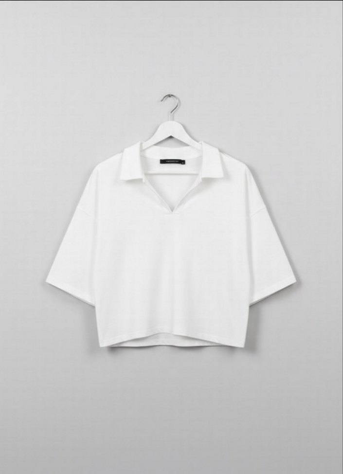Kadınlar için beyaz, kısa kollu, pamuklu gömlek. Yakalı, bol kesim ve normal midi boyda, minimalist normcore tarzında, günlük kullanıma uygun.