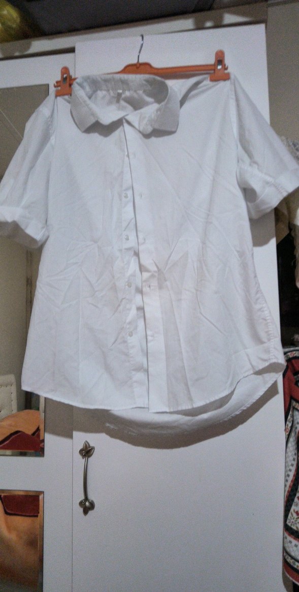 Beyaz, pamuklu, kısa kollu, düğmeli ve yakalı kadın gömleği. Salaş kesimi ve sade tasarımıyla günlük sokak stiline uygundur.