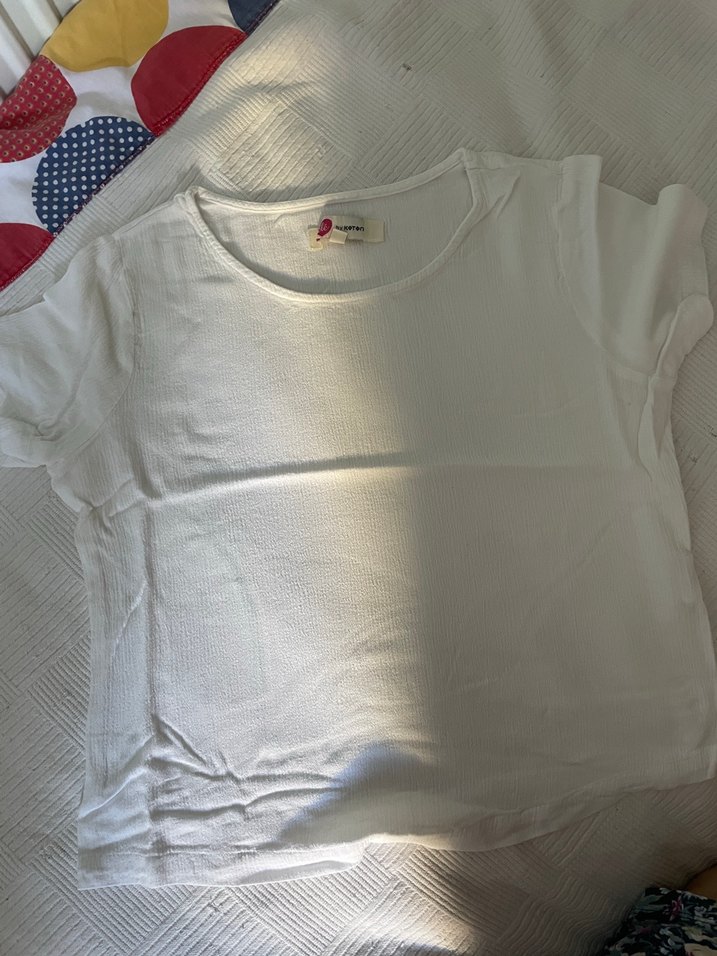 Beyaz kısa kollu, pamuklu, yuvarlak yakalı ve vücuda oturan kesime sahip tişört. Günlük kullanıma uygun sade ve rahat kumaş.