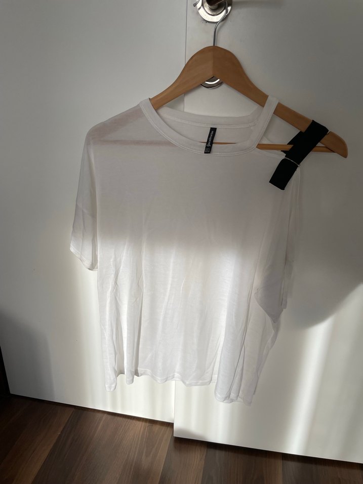 Kadınlar için beyaz pamuklu tişört, kısa kollu ve yuvarlak yakalıdır. Rahat ve salaş kesimi günlük kullanıma uygundur. Minimalist tarzda.