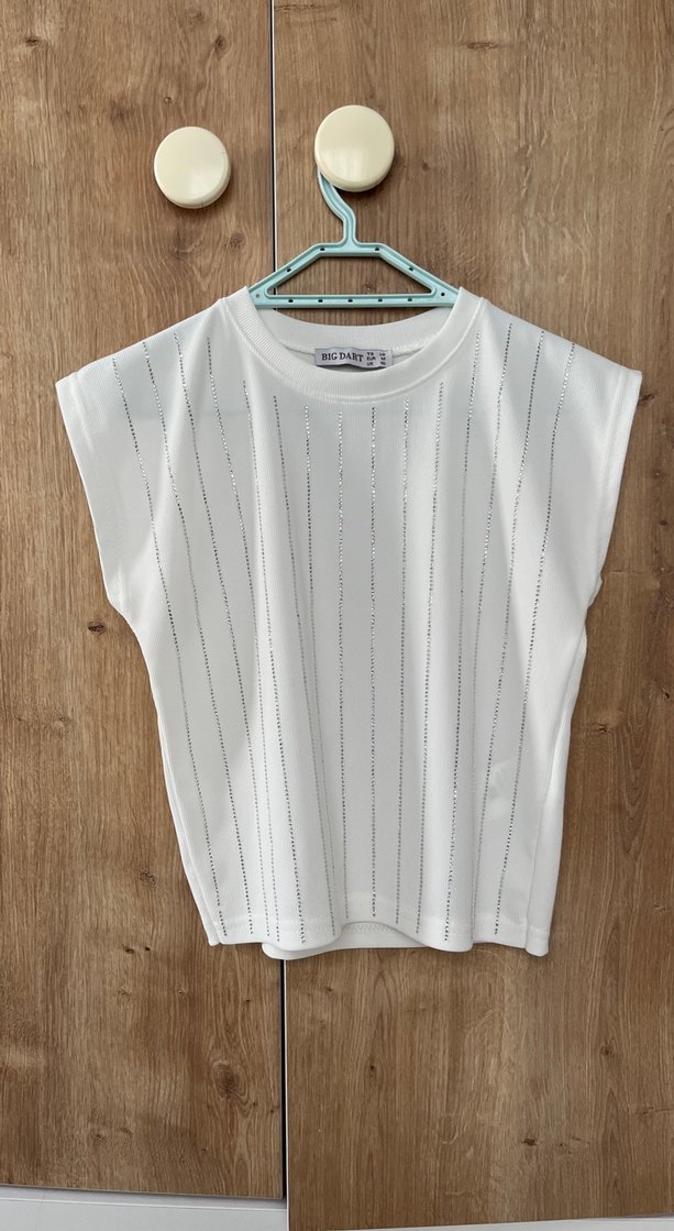 Beyaz renkli, kısa kollu, yuvarlak yakalı ve pilili detaylara sahip kadın bluzu. Salaş kesim ve kısa boyuyla günlük rahat sokak stiline uygundur.