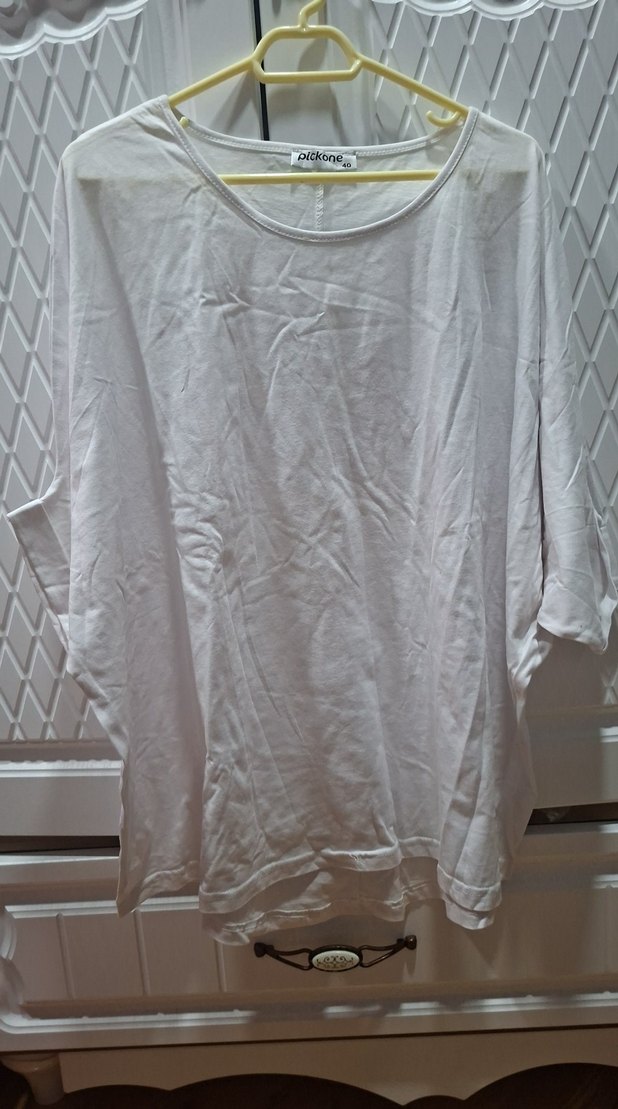 kısa kollu ve yuvarlak yakalı salaş kesim kadın tişört. 40 beden bol kesim yarasa kol. son resim kolunda bi leke olmuş cıkar mı yıkandgında bilmiyorum.