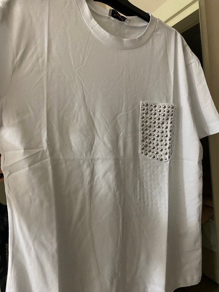 Kadınlar için beyaz, kısa kollu, yuvarlak yakalı ve taşlı cep detaylı bol kesim tişört. Günlük kullanım için yumuşak pamuk kumaştan yapılmıştır.