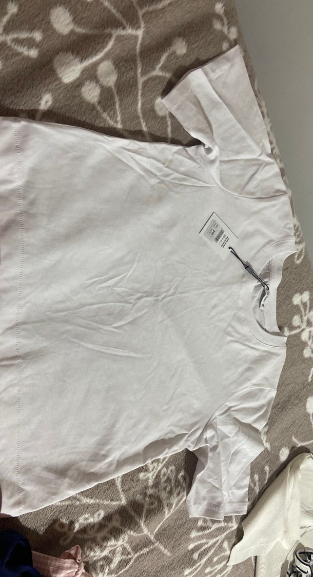 Kadın beyaz tişört, kısa kollu ve bisiklet yaka. Bol kesim ve normal midi boyda, minimalist ve sade günlük stil için uygundur.