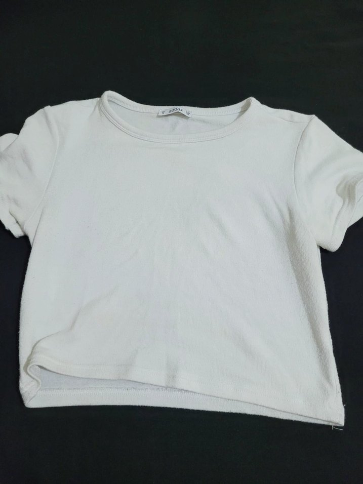 Kısa kollu, yuvarlak yaka ve pamuk kumaştan yapılmış beyaz renkli, fitted kesim kadın tişörtü.