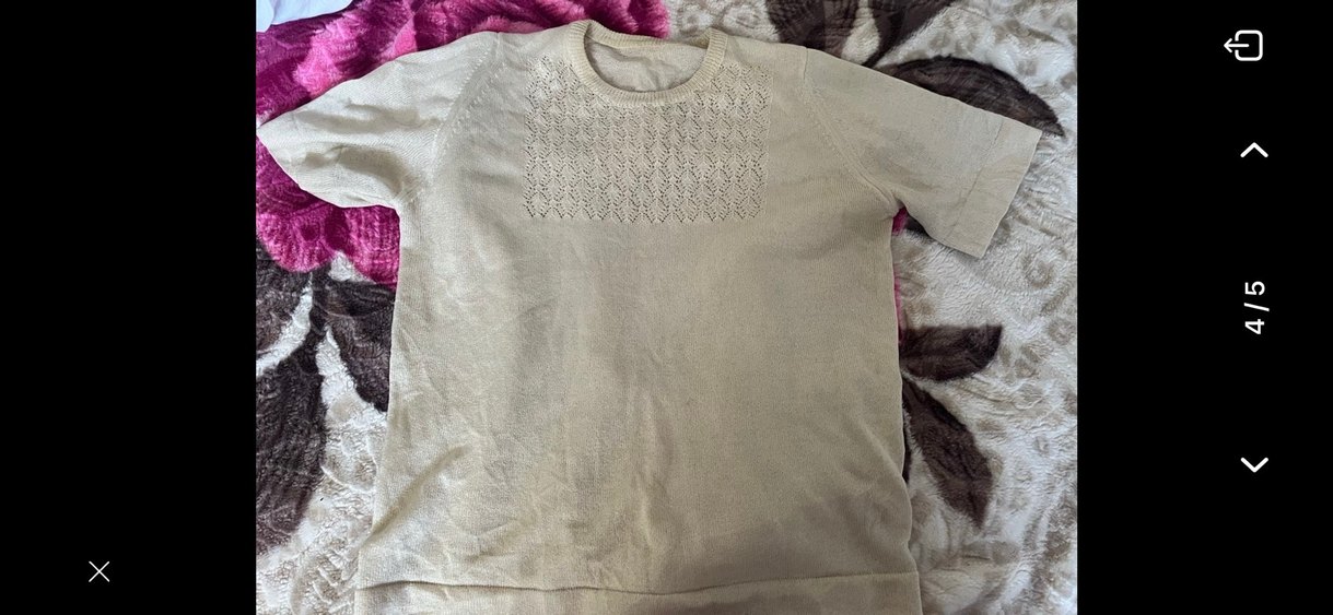 Kadınlar için yuvarlak yaka, kısa kollu ve bol kesim triko kazak. Göğüs kısmında ince örgü deseni bulunan, normal boyda, günlük kullanıma uygun yumuşak gri beyaz renkte.
