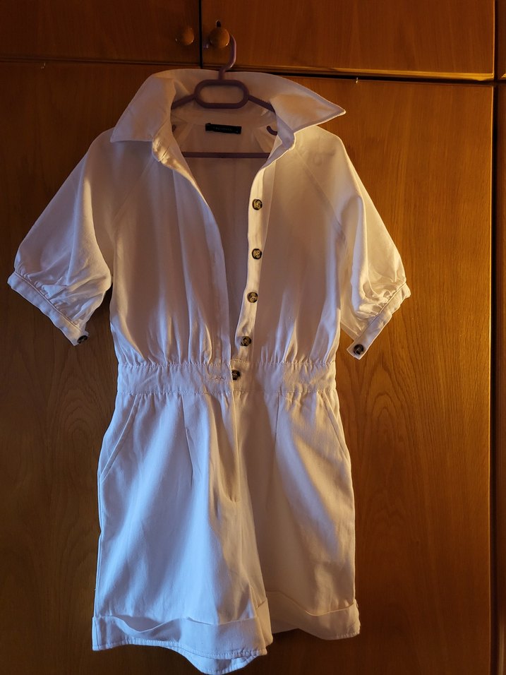 Düğmeli, yakalı ve kısa kollu beyaz kot tulum, rahatlığı artıran günlük kullanıma uygun.