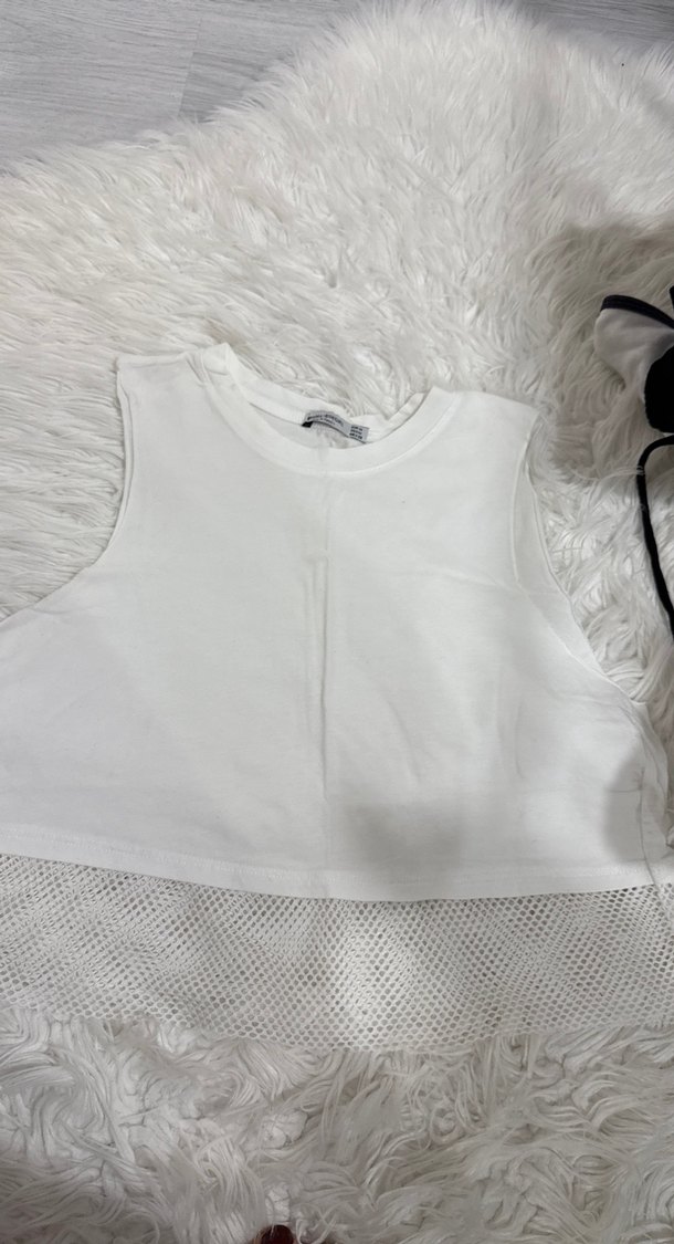 Kolsuz, beyaz ve kısa kesim bu crop top, yuvarlak yakalı ve etek kısmında fırfır detaylıdır. Yumuşak sentetik kumaştan üretilmiş, günlük ve spor tarzlara uygundur.