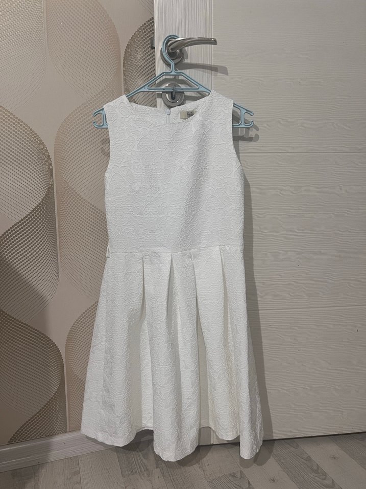 Kolsuz ve straplez tasarıma sahip, pile detaylı kadın elbisesi. Hafif keten kumaştan, beyaz renkte ve modern klasik stilde, rahat kesim.