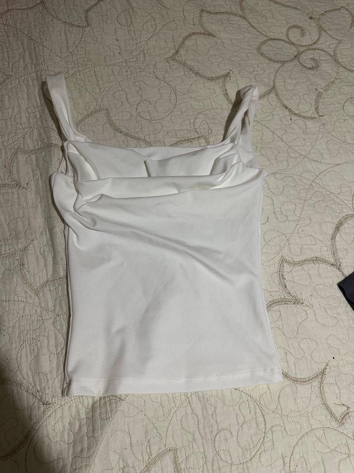 Beyaz kolsuz, keten kumaştan, tek renk ve dar kesim kadın bluz. Günlük sokak stili için uygun, rahat ve şık görünümlü.
