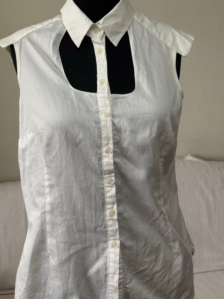 Bu kolsuz beyaz gömlek, yakalı ve düğmeli tasarımıyla, parlak görünümlü ve rahat kesimli şık bir iş kıyafetidir.