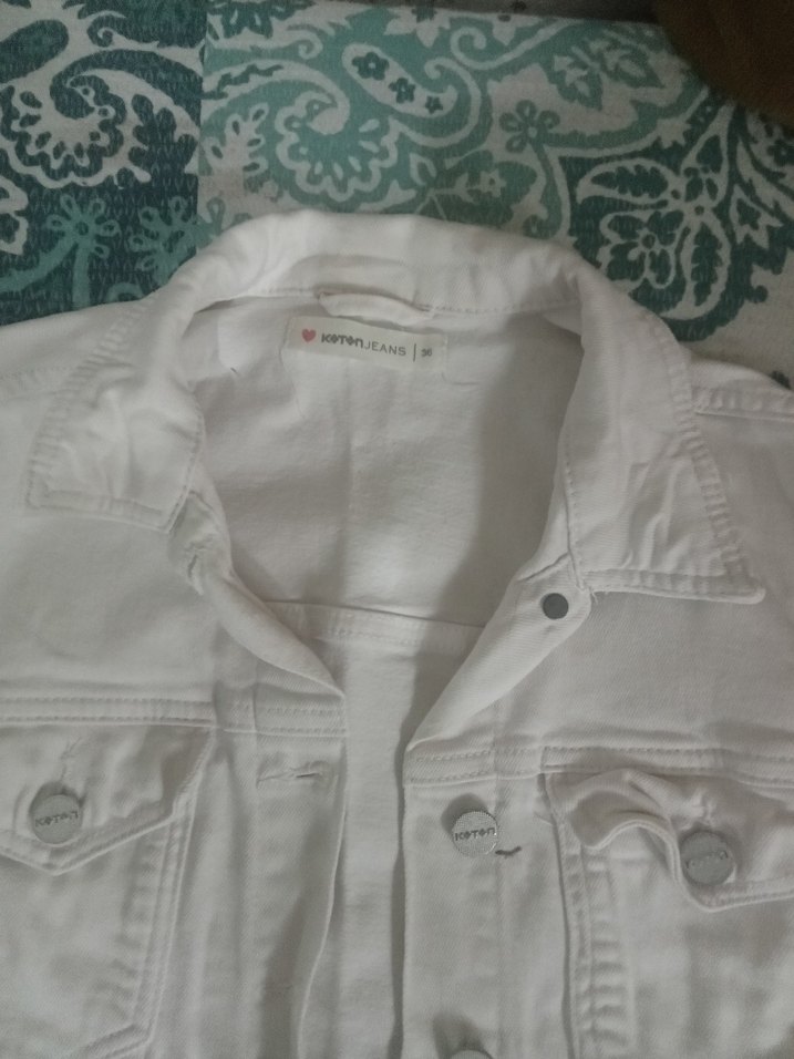 Pamuklu, düğmeli, beyaz kolsuz kot ceket. Rahat kesimi ve notlu yaka detayıyla günlük kullanım için uygundur.