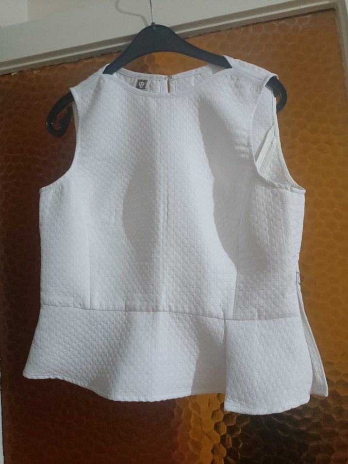 Kolsuz, bisiklet yaka beyaz bluz, dokulu sentetik kumaştan, normal kesim ve midi boyda. Fermuar detayı bulunur, minimalist ve sokak tarzı için uygun.