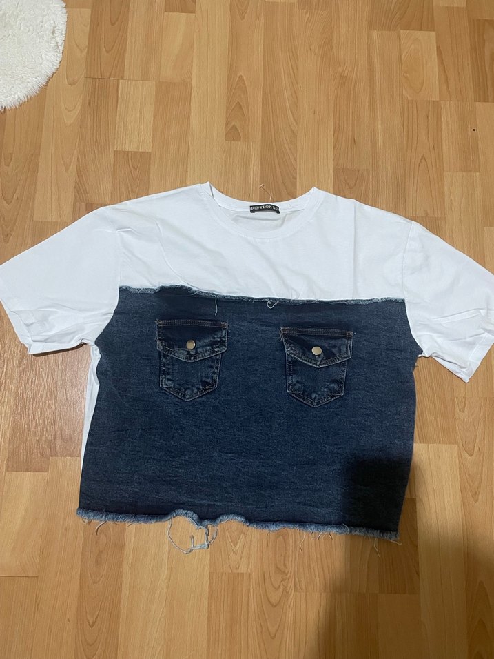 Kadınlar için kısa kollu, yuvarlak yakalı ve bol kesim tişört. Beyaz kumaş ve koyu kot detaylı, düğmeli ceplerle günlük sokak stiline uygun.