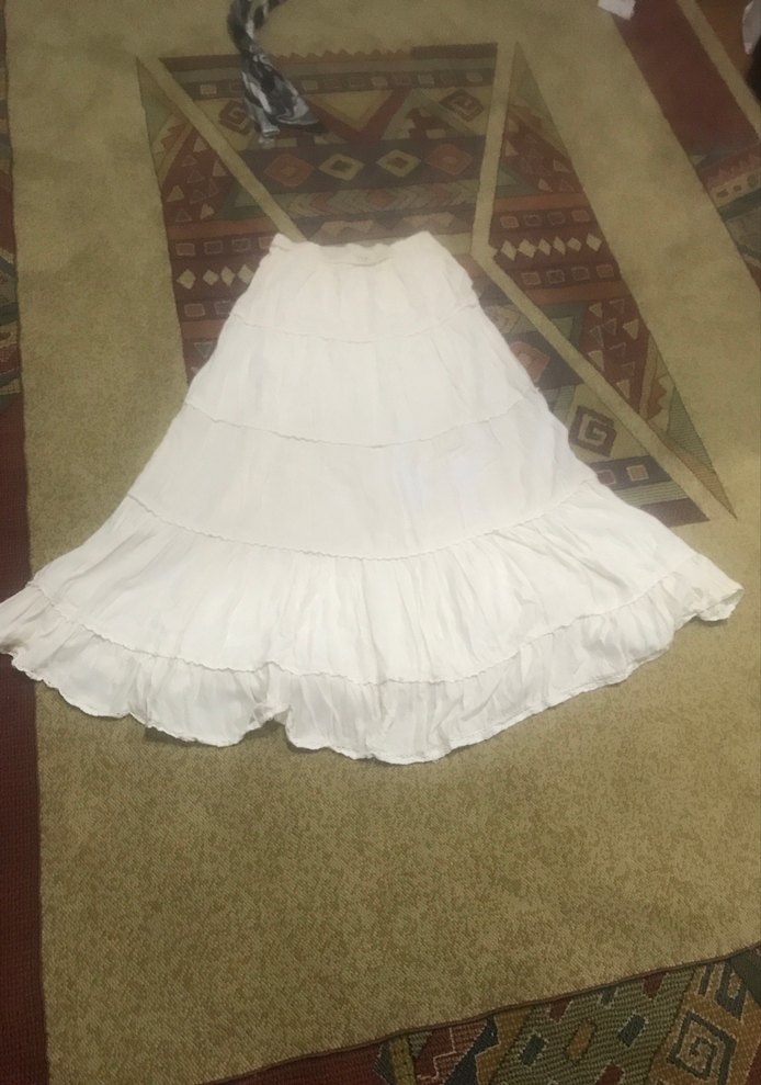 Beyaz krem batik uzun keten etek, bol kesim ve fırfır detaylıdır. Yumuşak keten kumaştan yapılmıştır. Bohem ve retro tarzlara uygundur, her tarz giyin için idealdir. Beli lastikli ve Astarlıdır, iç göstermez . Son görselde eteğin ucundaki nakış açılmıştır dikilebilir kullanışlı bir etek
