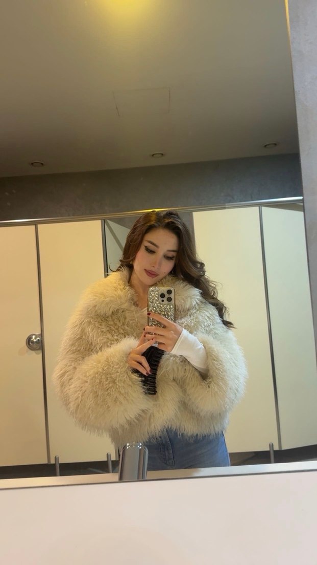 Beyaz/Krem suni kürk mont, normal boyda. Uzun kollu, yün dokulu ve rahat sokak modasına uygundur.