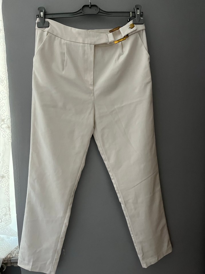 Kadınlar için beyaz kumaş pantolon, kemerli ve midi boyda, ofis ve günlük sokak tarzına uygun. Sentetik kumaştan, desensiz ve rahat kesim.