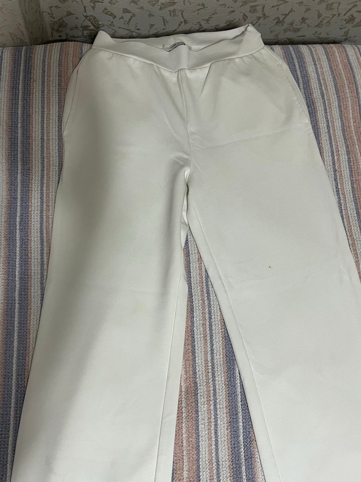 Uzun, beyaz,kumaş pantolon. Minimalist tasarıma sahip, günlük rahatlık için yumuşak sentetik kumaştan üretilmiştir. Ufak bir lekesi vardır #eşofman #pantolon