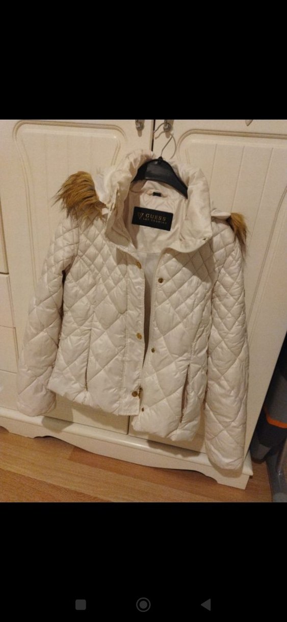 Kadınlar için fitted kesim, parlak beyaz kapitone desenli kışlık mont. Kapüşonunda kürk detayları, yaka tipi notched lapel ve askılı kollar bulunur. Normal midi boyda, sentetik kumaştan, gençler için günlük kullanıma uygun. ❄️ çok az kullanılmış hiç bı yierinde sıkıntı yok