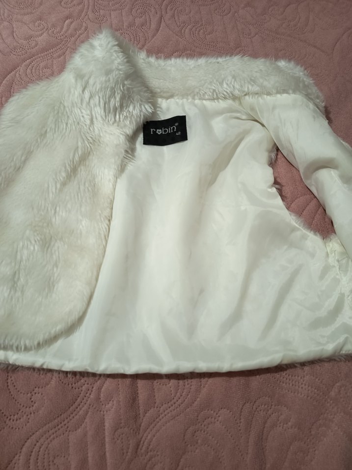 Kadınlar için beyaz kürk detaylı, uzun kollu, yumuşak kumaştan yapılmış, notched lapel yakalı ve midi boyda fitted ceket. Sokak stiline uygun, günlük kullanıma elverişli. ❄️
