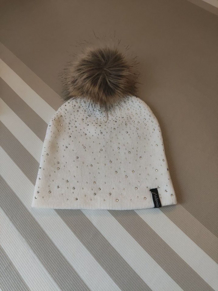 Kadınlar için beyaz triko bere, kürk ponpon ve küçük süs taşlarıyla hareketlendirilmiş. Rahat ve şık sokak stili için uygundur. ❄️