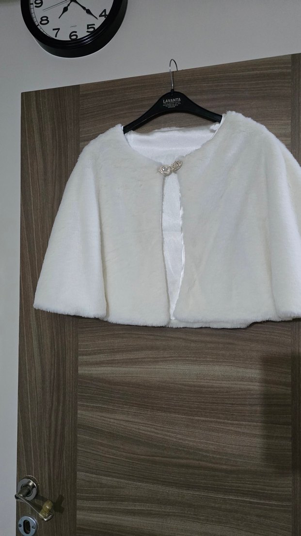 Kadın için yumuşak beyaz kürklü bolero, uzun kollu ve yuvarlak yakalı, bol kesim ve modern klasik tarzda. ❄️