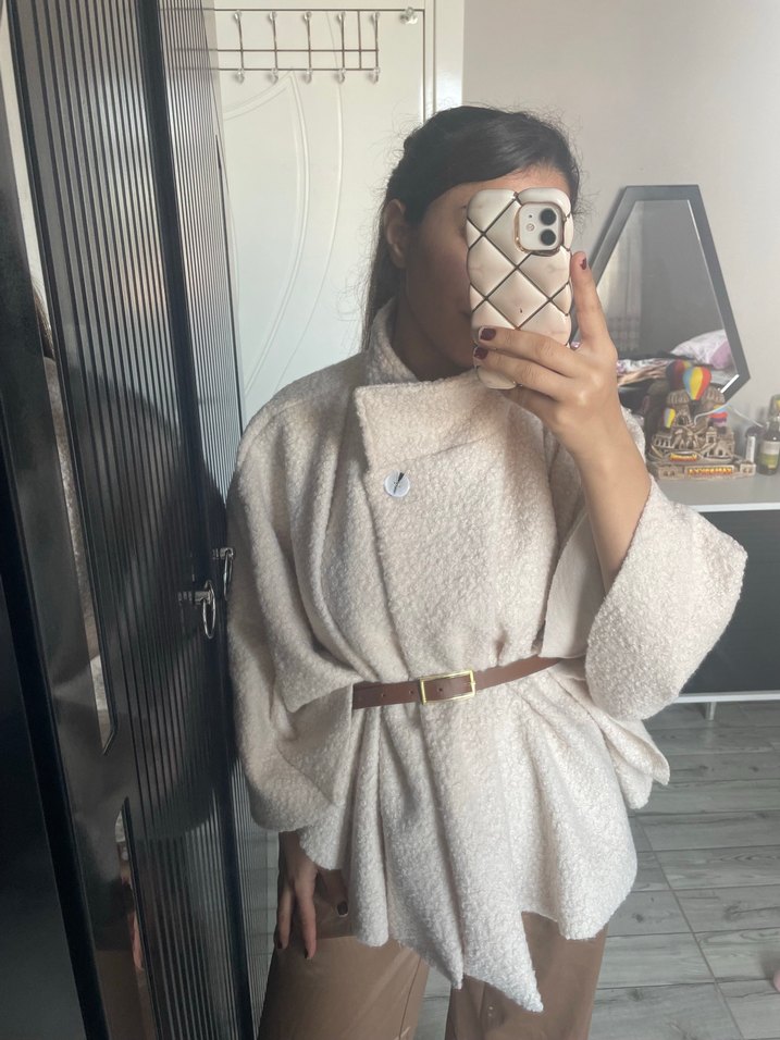 Bu kadın panço, yumuşak ve rahat kumaş, kürk detayları ve kemer ile trendy bir sokak stili sunar. Açık beyaz rengi günlük kombinlere taze bir dokunuş katar.