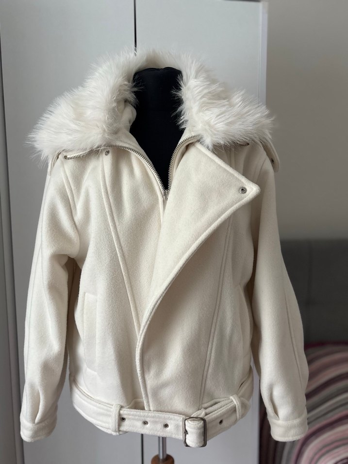 Hiç giyilmedi denedim sadece.Kadınlar için tasarlanmış, uzun kollu ve kürklü yakaya sahip bol kesim beyaz ceket. Midi boyda, bel kemerli ve sıcak dokulu kumaştan üretilmiştir. Sokak stiline uygun şık bir parça. ❄️