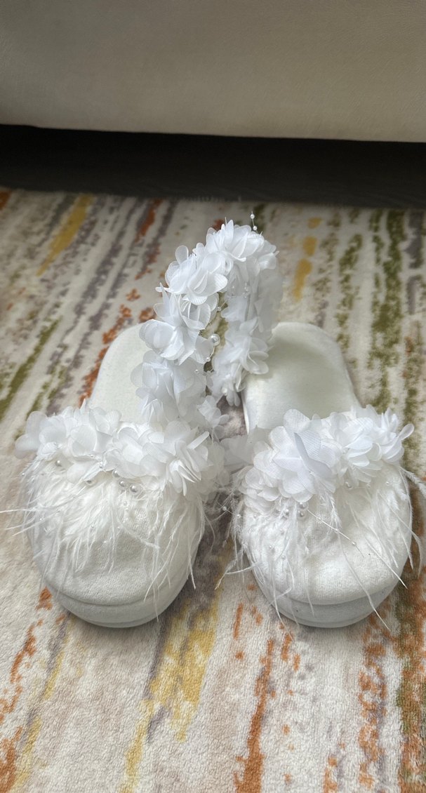 Beyaz kadın terlik, platform topuklu, sentetik kürk ve çiçek işlemeleriyle süslenmiş, rahat ve bohem tarz sunar.