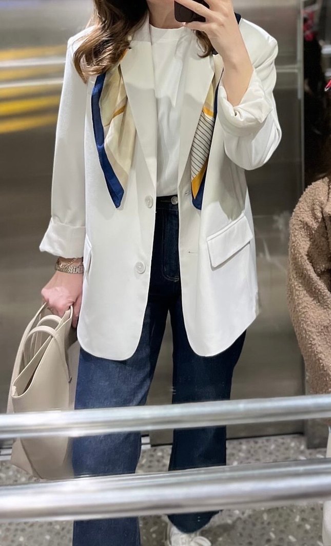 Kadın beyaz kuşaklı blazer, normal uzunlukta ve regular fit. Sentetik kumaştan, notched lapel yakalı, günlük sokak stili için uygun. Strappy kollu, hafif tie-dye desenli.