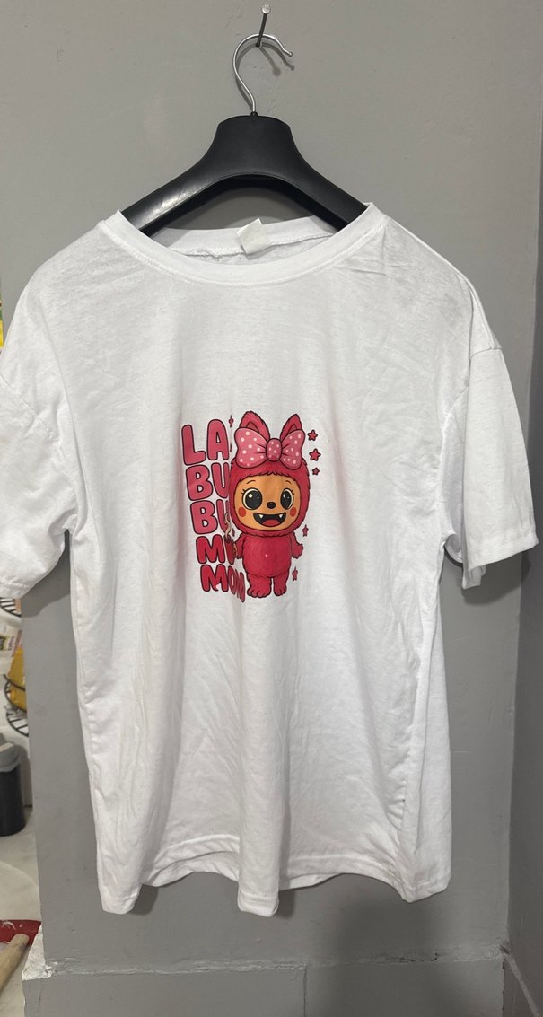 Beyaz pamuklu labubu baskılı, kısa kollu ve bol kesimdir. Ön kısmında baskılı karikatür deseni ve yuvarlak yaka bulunur.