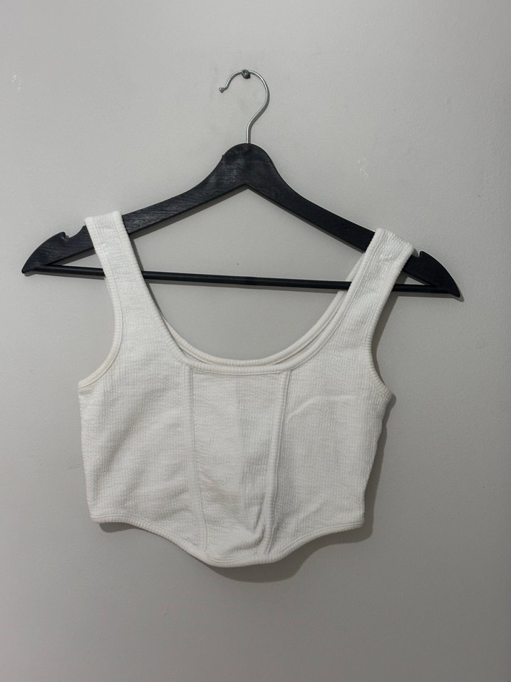 Beyaz, askısız kısa ve vücuda oturan kesime sahip minimal kadın büstiyer. Günlük kullanıma uygun şık parça. İkisini de satıyorum ikisi 150 tl.