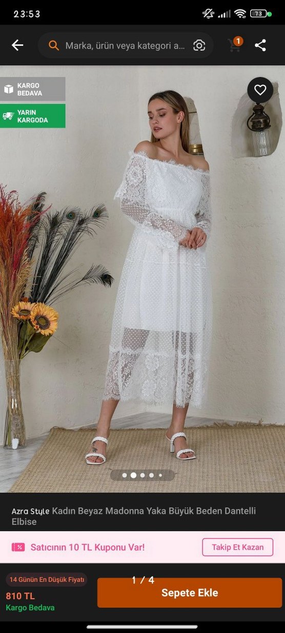 Beyaz uzun elbise, dantel detaylı ve madonna yakalıdır. Bol kesim ve askılı kollara sahiptir, bohem düğünler için uygundur.