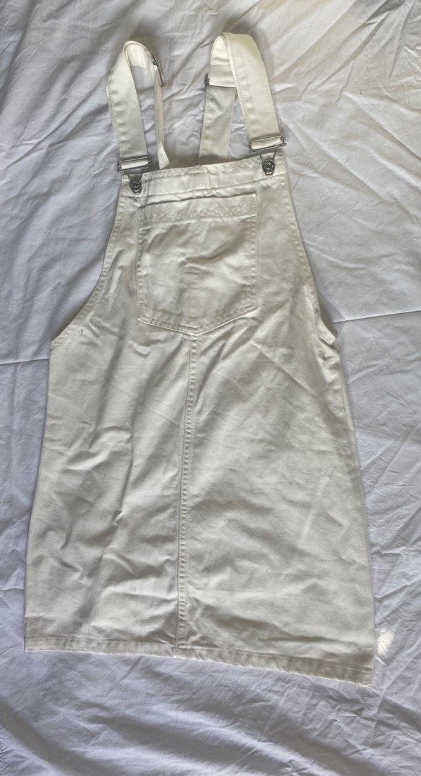 Sentetik kumaştan, yüksek yakalı, askılı ve bol kesim beyaz midi tulum. Önünde cep bulunur, gündelik kullanıma uygundur.