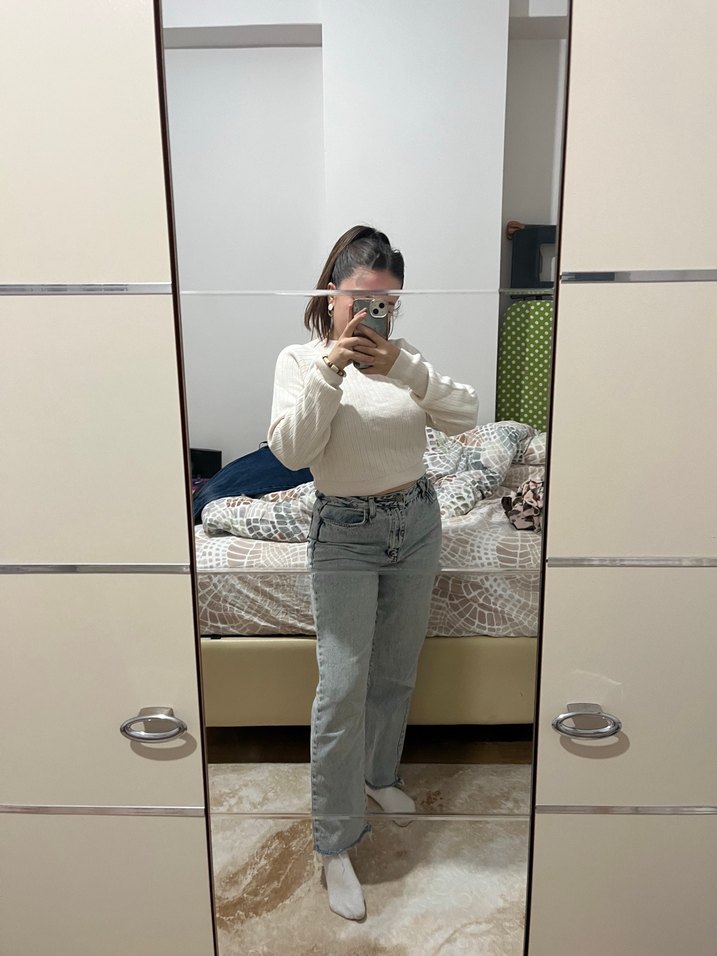 Kadınlar için bol kesim ve midi boyda, hafif beyaz denimden üretilmiş pantolon. Günlük kullanım için rahat ve şık bir görünüm sunar.