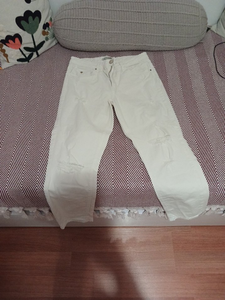 Pamuk kumaştan beyaz midi boy, bol kesim kot pantolon. Günlük kullanıma uygun, sade ve rahat bir sokak stili.