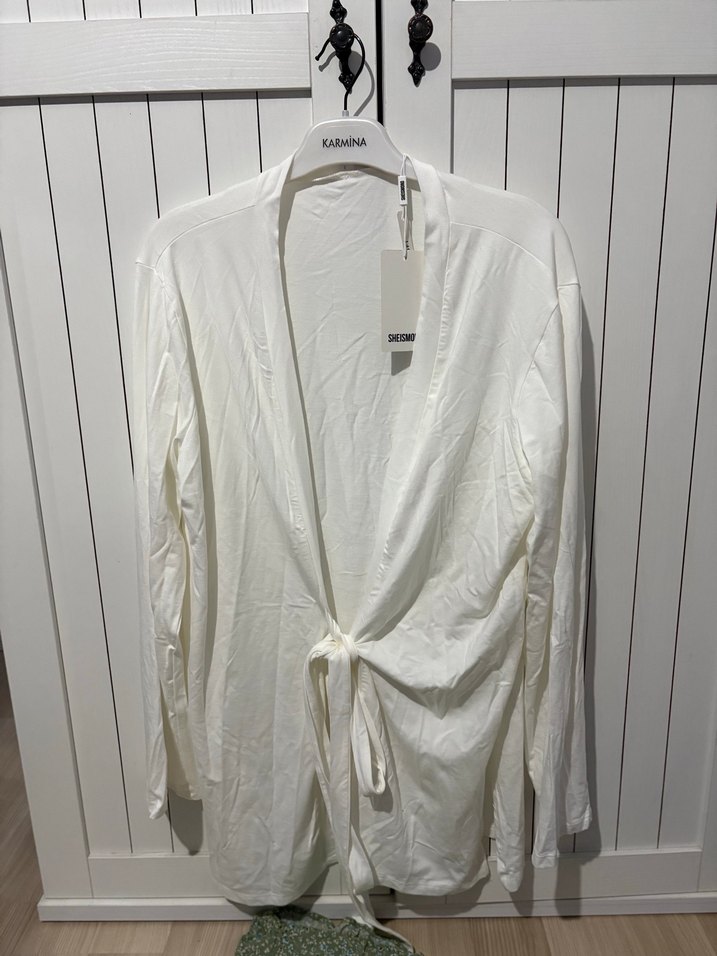 Kadınlar için uzun kollu, salaş kesim midi boy sabahlık. Minimalist tarzda, açık beyaz renkte, bağlama kemeri ile birlikte.