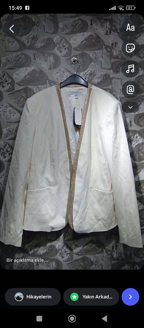 Kadın ceket, kesik yakalı ve uzun kolludur. Normal kesim ve midi boydadır, yumuşak sentetik kumaştan yapılmıştır. Beyaz ceket, kenarlarında kürklü detay içerir, ofis için klasik ve şık stil sunar.