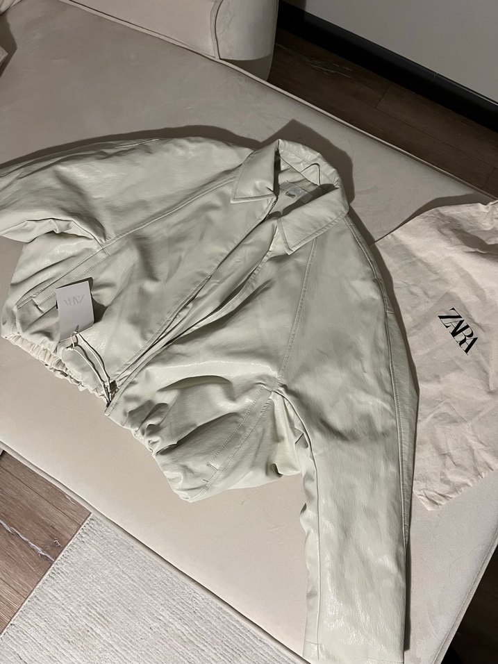 Beyaz midi boy, notalı yaka ve uzun kollu kadın deri ceket. Fermuarlı detayları ve rahat kesimiyle sokak stiline uygun.