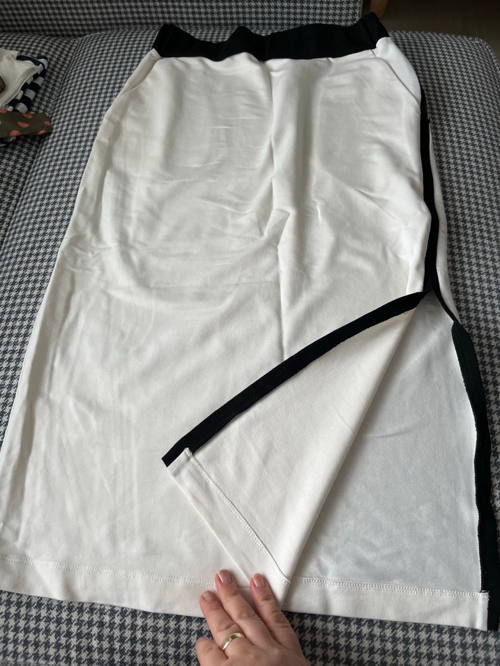 Kadın beyaz midi boy fermuarlı etek, siyah yan şeritli, sentetik kumaştan, günlük spor tarz için uygundur.