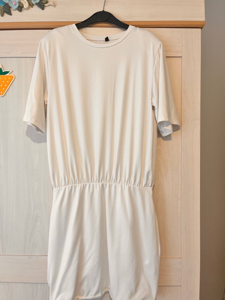 Kadın beyaz midi tulum, kısa kollu ve yuvarlak yakalıdır. Bel kısmı büzgülü ve bol kesimdir, yumuşak sentetik kumaştan üretilmiştir.