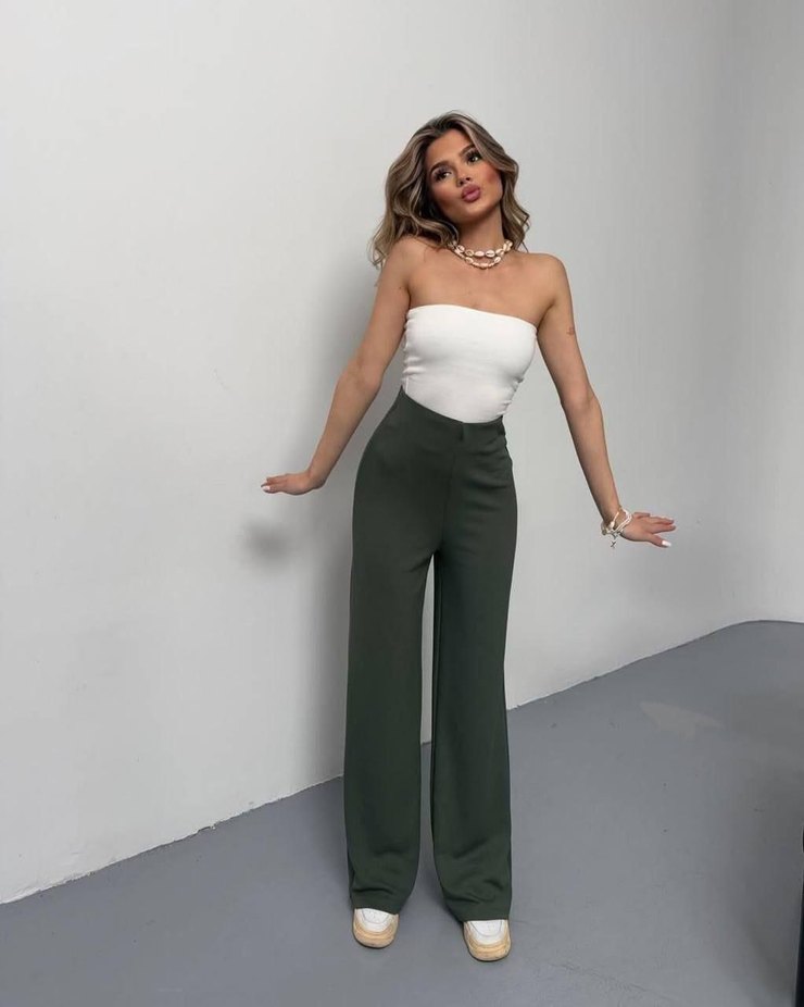 Kadınlar için regular fit, midi boy, beyaz renkte yumuşak kumaştan yapılmış rahat ve şık kumaş pantolon. Günlük kullanım için uygundur.