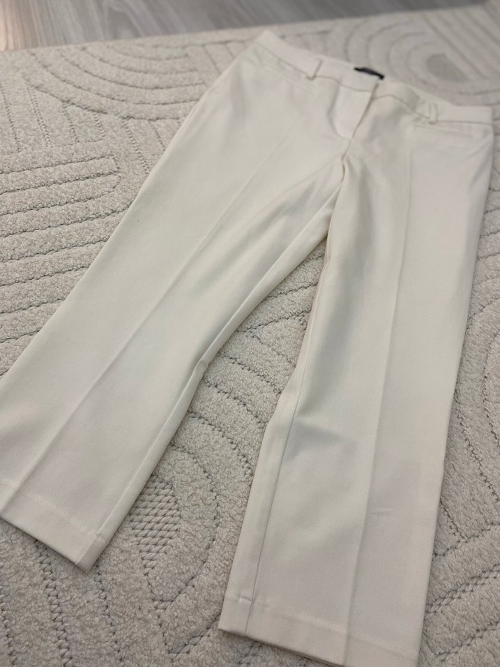 Kadın beyaz midi uzunlukta, düz kesim, iş ortamına uygun kumaş pantolon. Rahat sentetik kumaştan yapılmış, sade ve şık bir seçenek.
