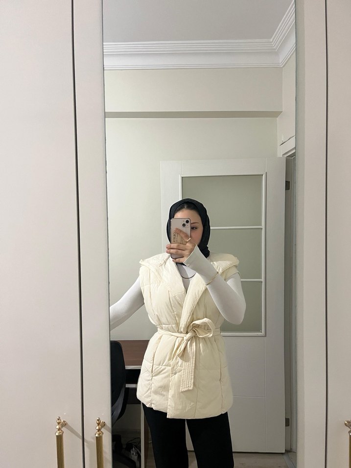 Pamuk kumaştan, yüksek yakalı ve kolsuz, beyaz şişme yelek. Minimalist, normcore tarzıyla günlük kullanıma uygun, rahat ve şık bir parça.