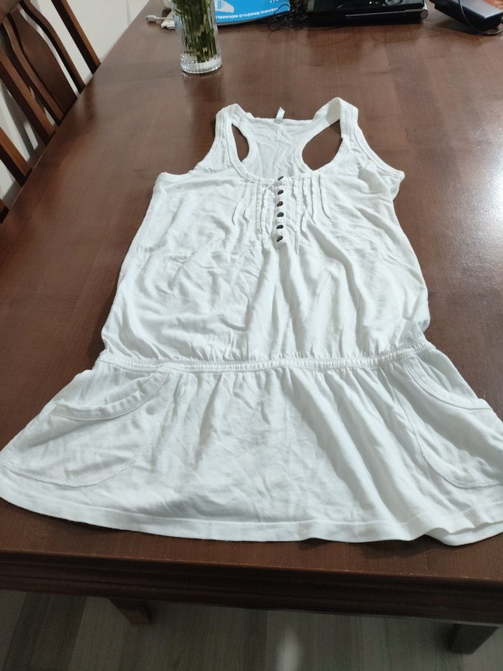 Yumuşak pamuk kumaştan, salaş kesim ve fırfır detaylı beyaz kolsuz midi buluz, yuvarlak yaka ile rahat bohem tarzda.