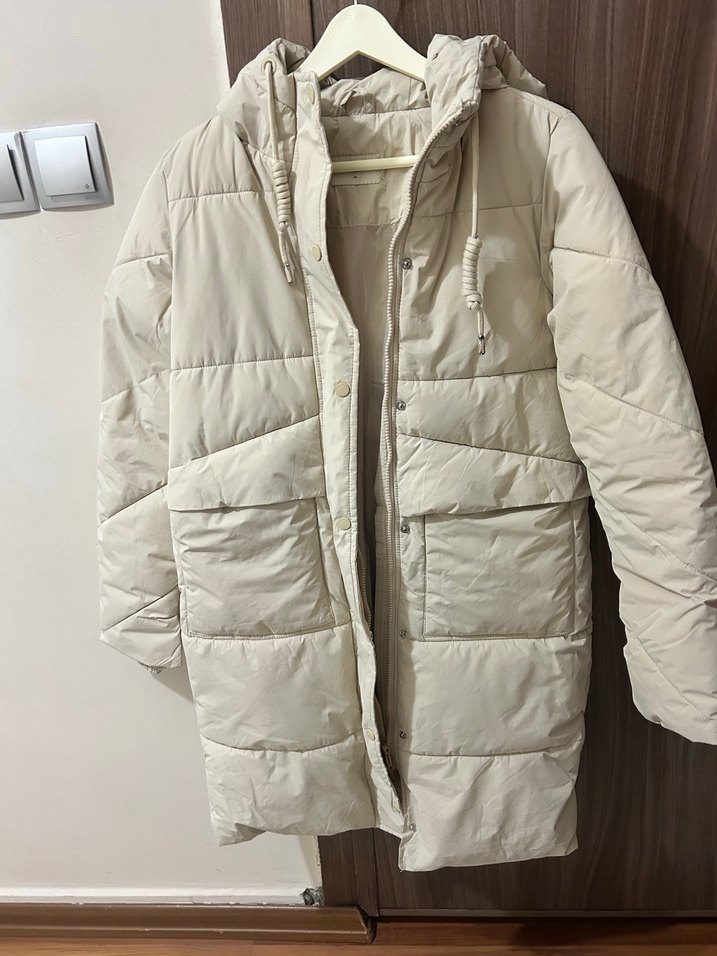 Kadın Beyaz Midi Uzunlukta Kapüşonlu Mont