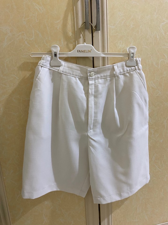 Pamuk kumaştan, pilili detaylara sahip, bol kesim beyaz mini Bermuda şort. Minimalist, desensiz ve günlük kullanıma uygun hafif tasarım.