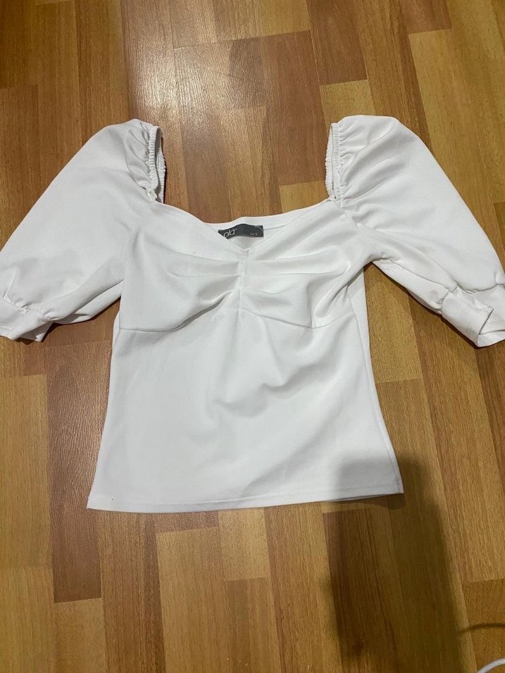 Beyaz mini bluz, kısa kabarık kollu ve kayık yaka detaylıdır. Düz, sentetik kumaştan yapılmış olup, şık ve minimal bir görünüme sahiptir.